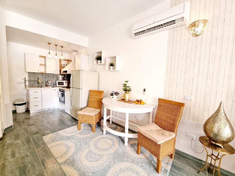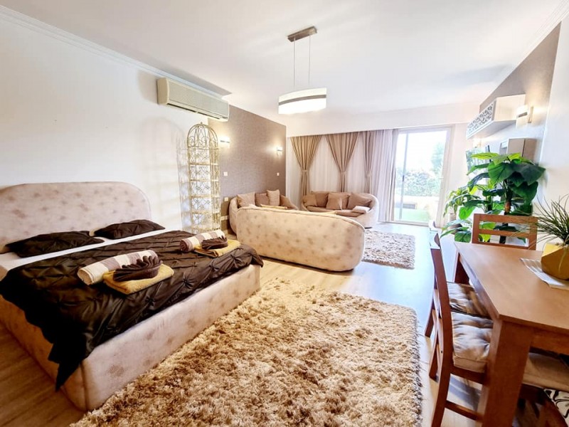 Súkromný 2-4-lôžkový apartmán (70m2) so súkromnou terasou s výhľadom na bazén. Vybavenie: kuchynka so šporákom, el. i mikro rúrou, umývačkou, chladničkou a riadom, kúpeľňa, WC, klimatizácia, TV. WIFI za poplatok. Zdarma vstup do bazénov, na pláž, plážové lehátka. Obchody a lekáreň neďaleko. Reštaurácia na pláži. Celá špecifikácia.